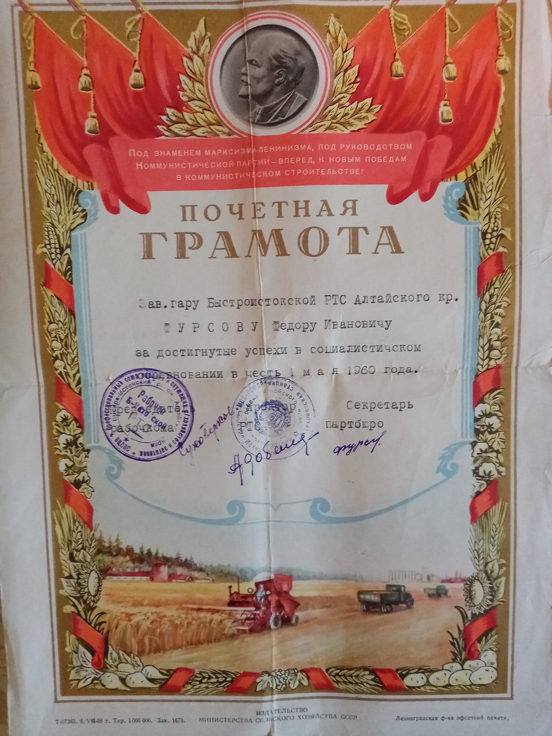 Почётная грамота Фурсову Ф. И. Быстроистокский район. с. Верх-Ануйское. 1960 г.