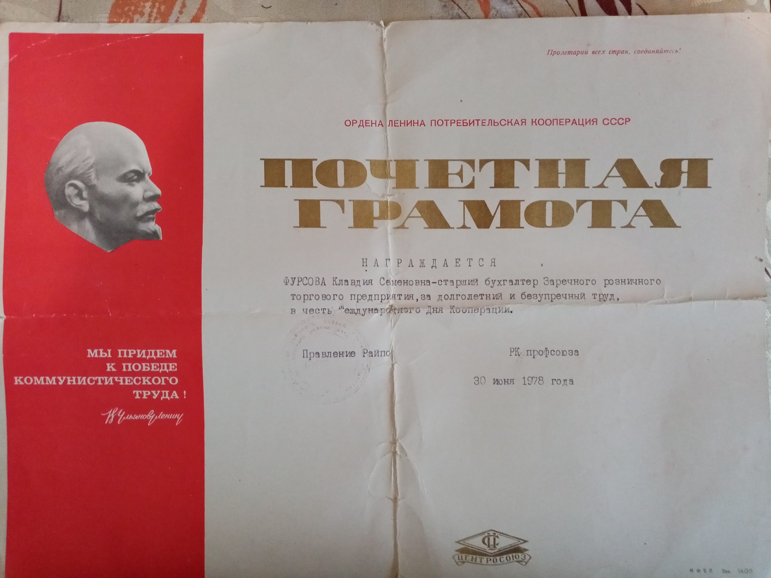 Почётная грамота Фурсовой К. С.. Быстроистокский район. с. Верх-Ануйское. 1978 г.